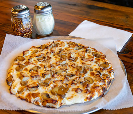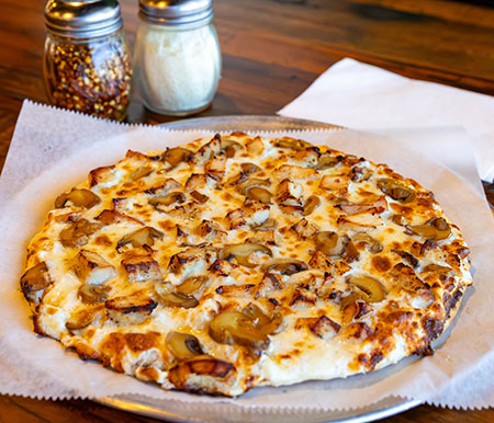 Chicken Alfredo Pizza features a creamy Alfredo sauce foundation, layered with chicken and cheese, resulting in a decadent, savory, and fulfilling meal that combines the essence of traditional Alfredo pasta with a pizza base. It incorporates components such as chicken, mozzarella cheese, mushrooms and Alfredo sauce, baked on a pizza crust until golden and bubbly
