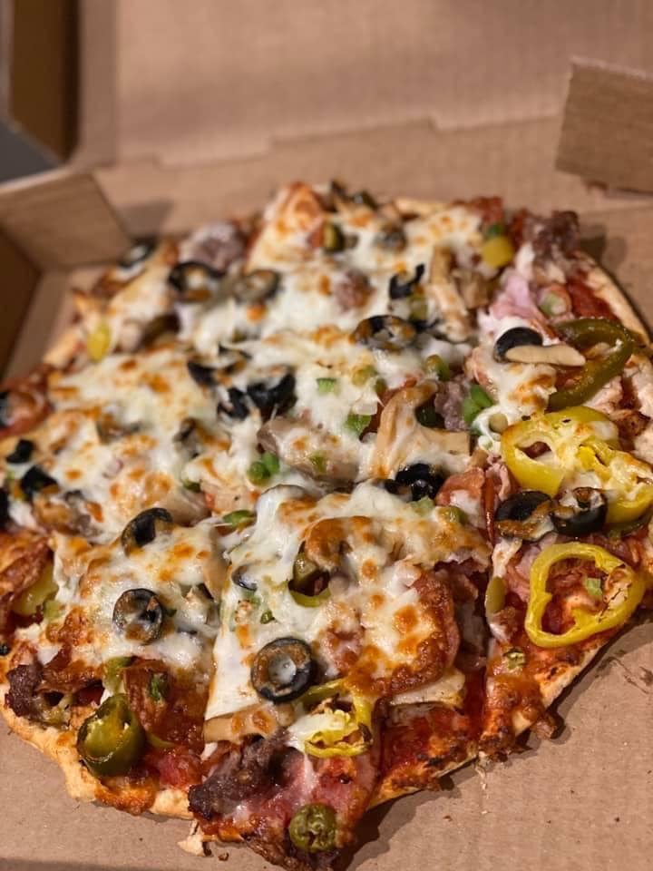 Wicked Base, Italian Sausage, Crumbled Sausage, Black Olives, Green Peppers, Jalapeños, Crushed Red Peppers, Pepperoncini Peppers, Hot Sauce
